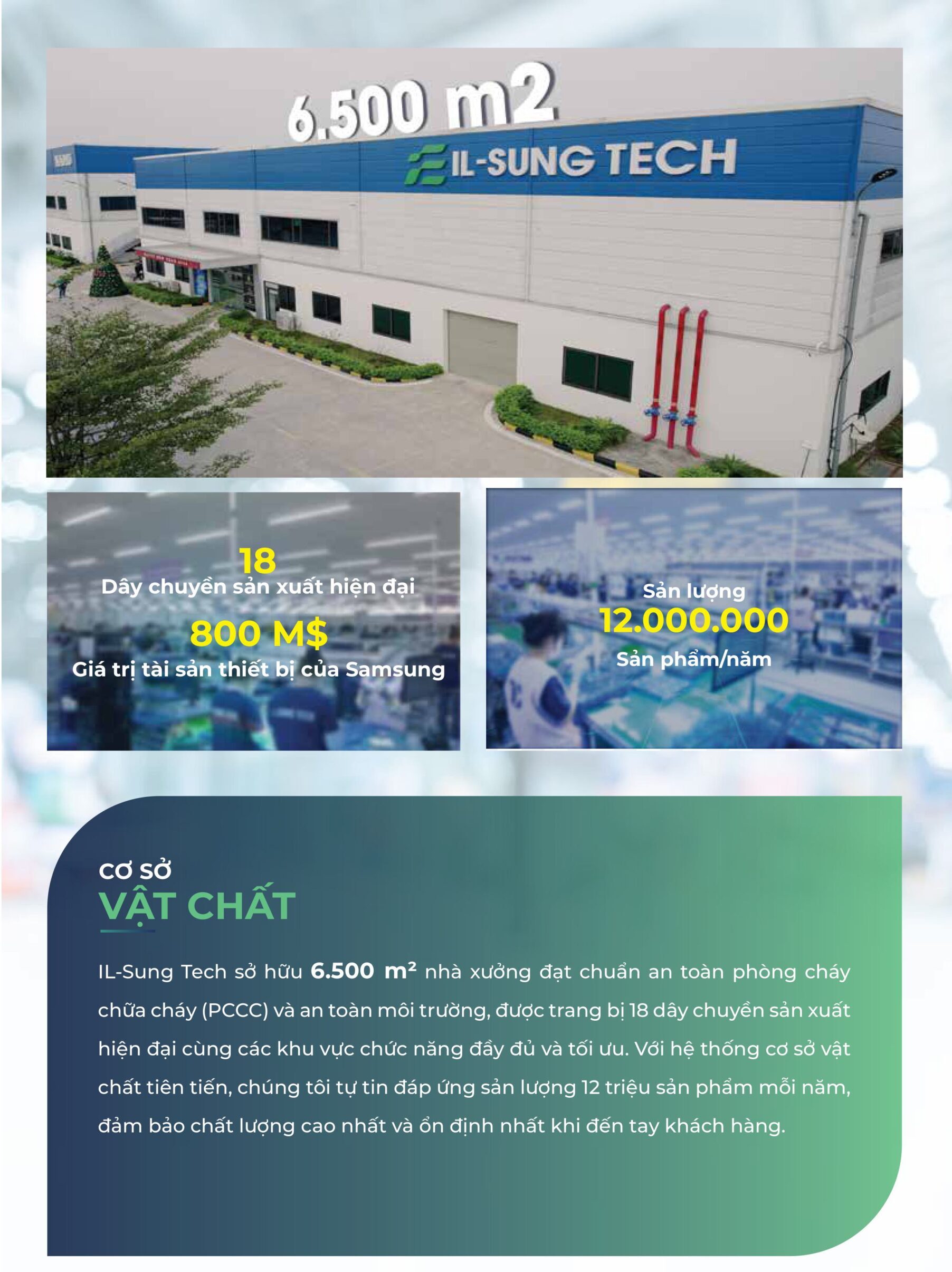 Hiện tại, IL-Sung Tech đảm nhận 25% sản lượng gia công lắp ráp metal rear cho Công ty TNHH Samsung Electronics Việt Nam Thái Nguyên. Chúng tôi tự hào là doanh nghiệp Việt Nam duy nhất đến thời điểm hiện tại tham gia trực tiếp vào công đoạn lắp ráp điện thoại thông minh cho Samsung Việt Nam.