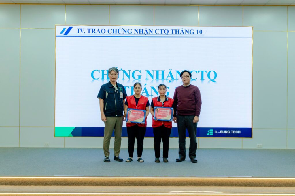 Vừa qua, Công ty Cổ phần IL-Sung Tech đã tổ chức Lễ trao chứng nhận “Nhân viên đa kỹ năng – CTQ” nhằm ghi nhận những nỗ lực, tinh thần trách nhiệm và đóng góp xuất sắc của các cá nhân trong hoạt động sản xuất.